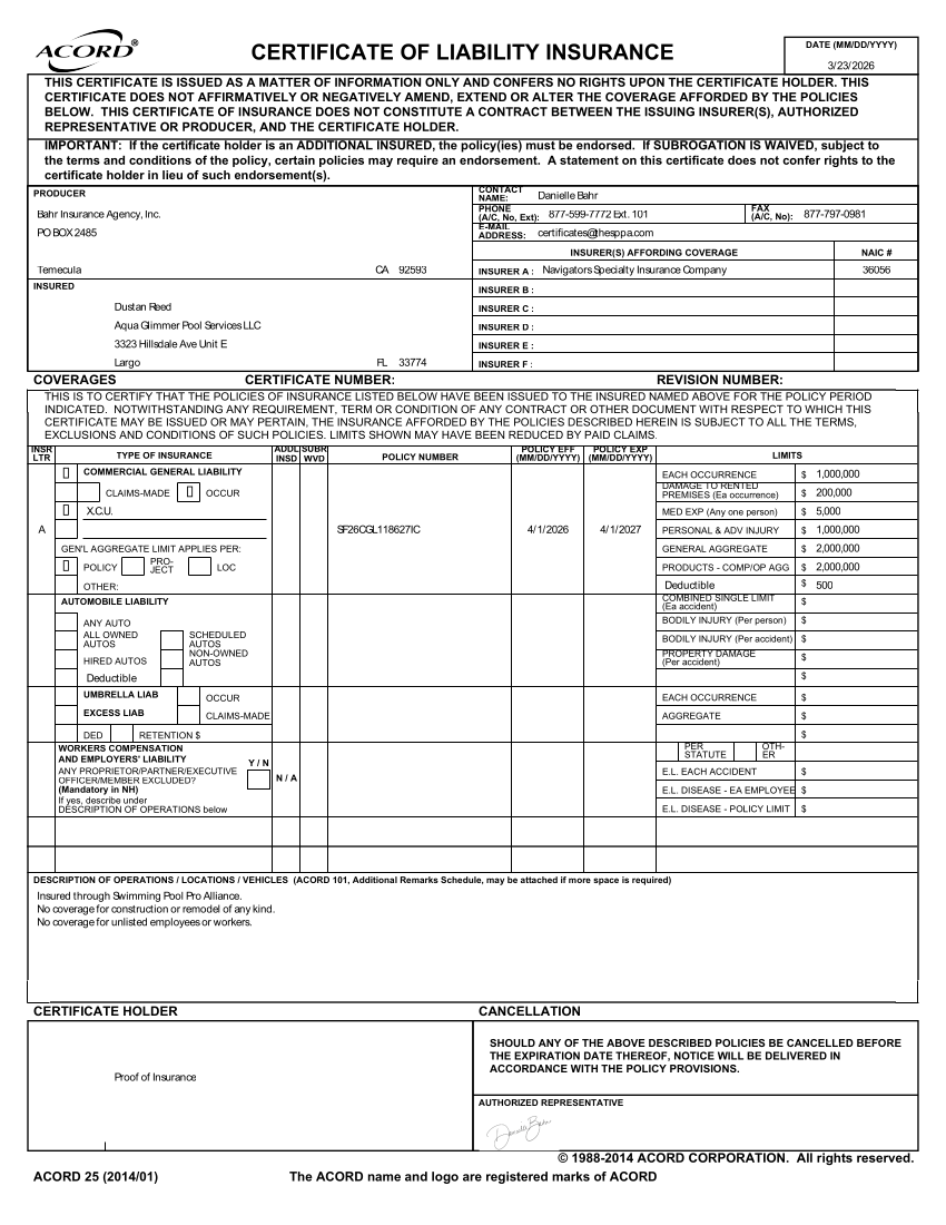 Our comprehensive insurance coverage demonstrates that Aqua Glimmer Pool Services is a professional and legitimate business in Largo, Florida, & surrounding areas taking full responsibility for our work and ensuring you're never left to deal with the unexpected financial burden.